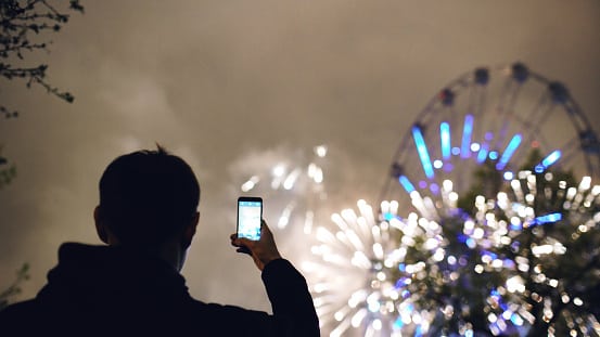 You don’t need to be a professional, or even own a high-end camera, to take fun fireworks photos. Use a low exposure shutter speed to capture long-lasting effects. Focus on the people around you with fireworks exploding in the background. Even candid photos of your designated fireworks lighter doing his or her job can become fun memories. Play around with the camera rather than stressing out about getting the perfect shot.